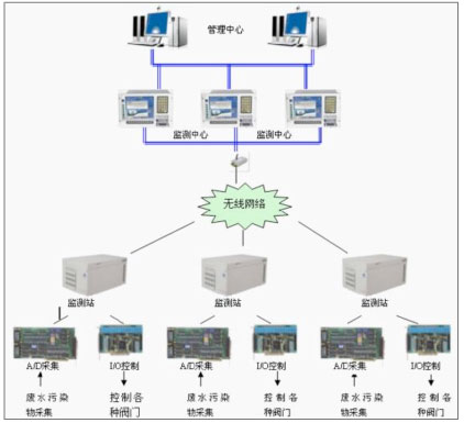 每个监测子站通过在线监测仪表对污染源排污口的排放状态进行 24 小时监控。将监测的数据、及仪器运行状态等现场采集的数据和信号通过 GPRS 、 CDMA 、 PSTN 、 VPN 光纤等通信方式,由数据采集器自动上传到环境监控中心,实现环境监控中心对监测数据、现场仪器运行状况的实时监控,根据上传的信息对现场仪器采集的数据进行质量控制、分析审核,对 企业的污水处理情况进行管理。